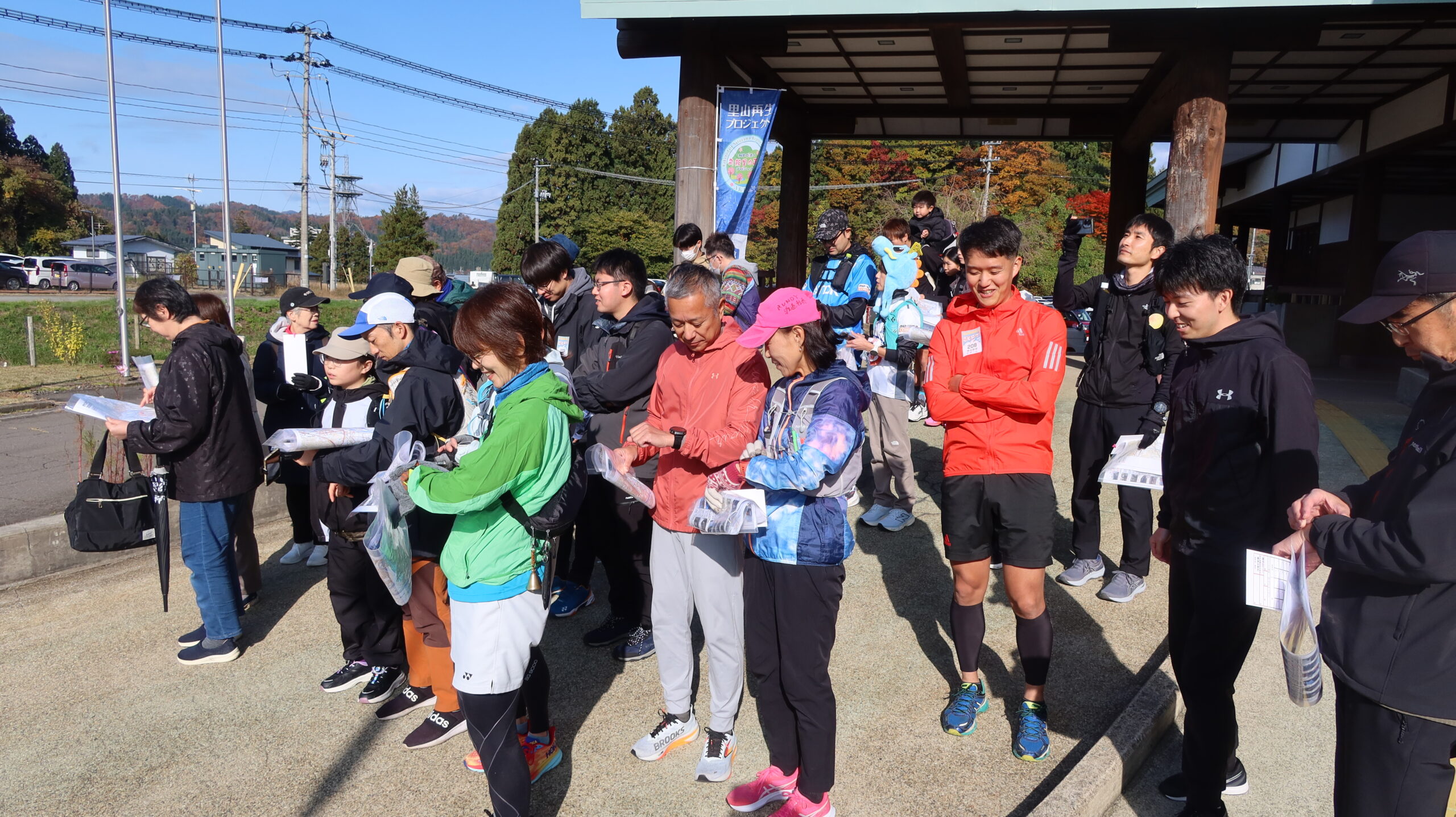 例例年であればみぞれ空もある降雪期に入る頃なので、ファミリー層が回れるようなコース範囲を心がけました。連日続いた曇天・雨天が一転当日は好天。早朝開始時刻のずっと前から参加者が参集していました。